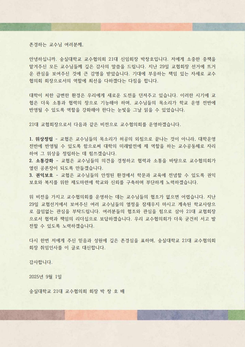 21대 교협회장 취임인사 페이지 정보 작성자 최고관리자 댓글 0건 조회 373회 작성일 25-09-03 18:03 목록 본문 . 이전글교협소식 25-2-01 25.09.08 다음글숭실대학교 제21대 교수협의회 회장 선거 안내 25.06.02
