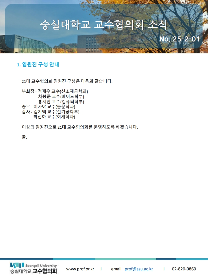 교협소식 25-2-01 페이지 정보 작성자 최고관리자 댓글 0건 조회 262회 작성일 25-09-08 11:34 목록 본문 . 이전글2025년 숭실대학교 교수협의회 장학생 선발 안내 25.09.08 다음글21대 교협회장 취임인사 25.09.03